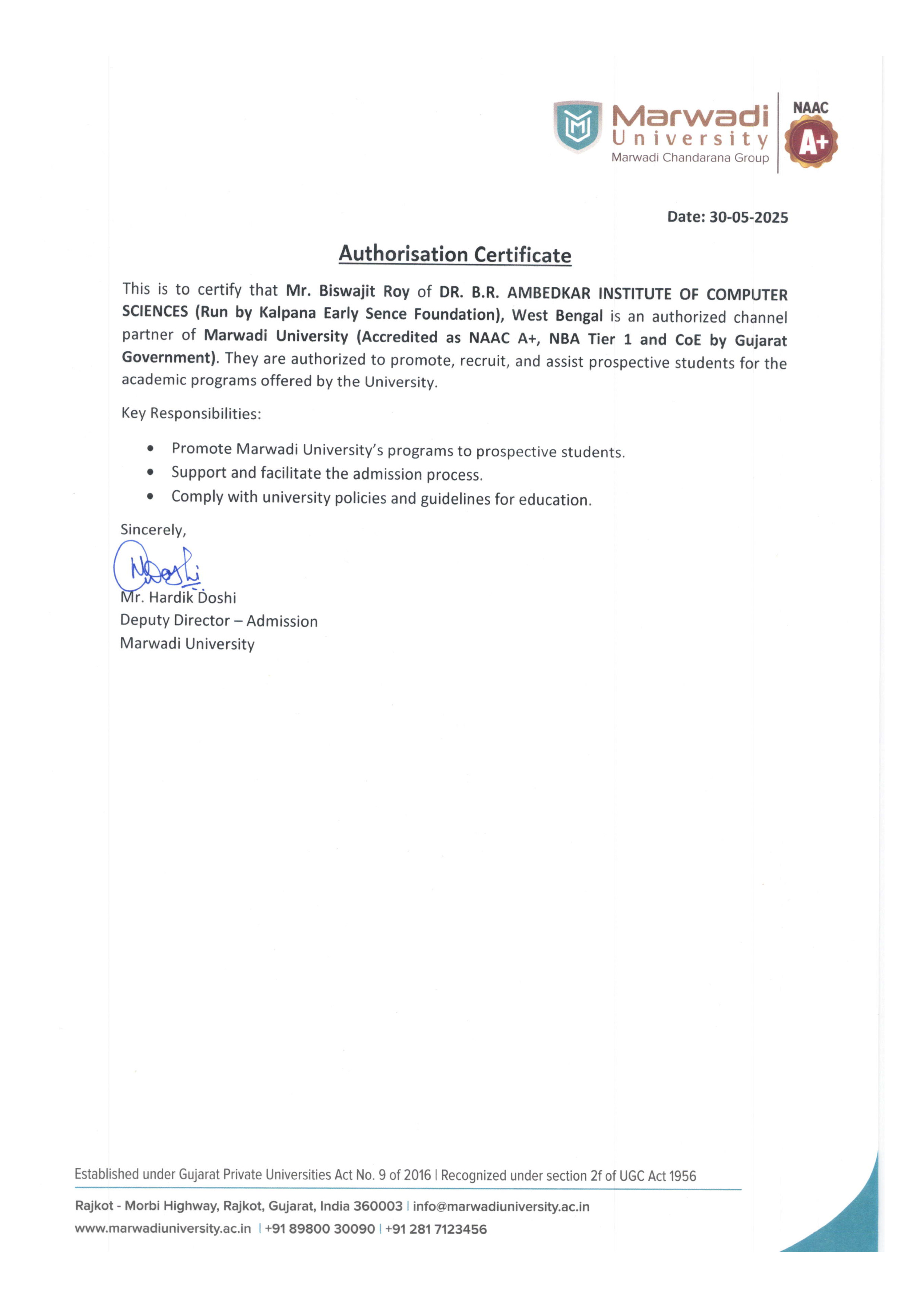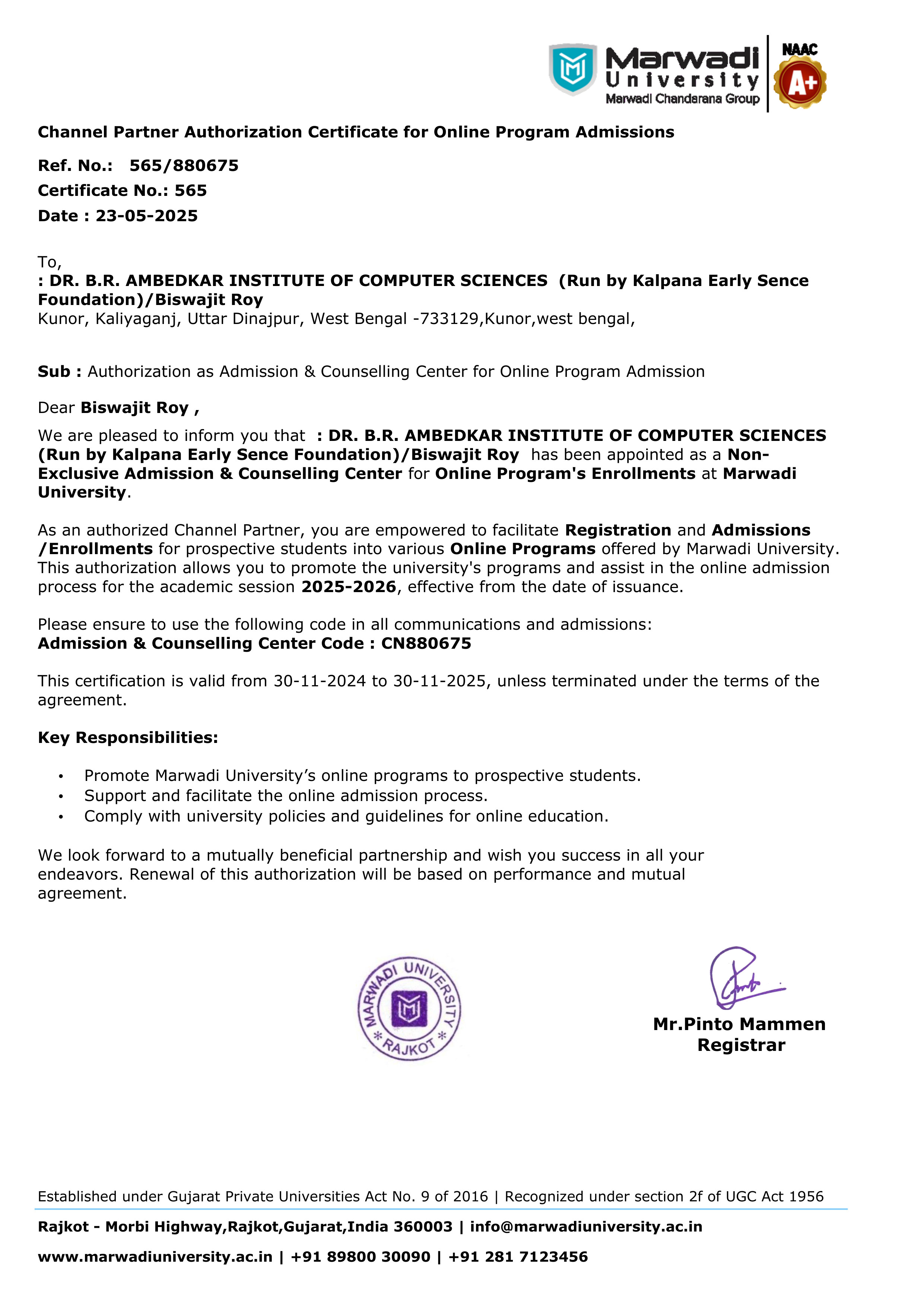 Dr. B.R. Ambedkar Institute of Computer Sciences is legally governed by Kalpana Early Sence Foundation, a Section-8 company under the Companies Act, 2013. Our institutional identity includes: